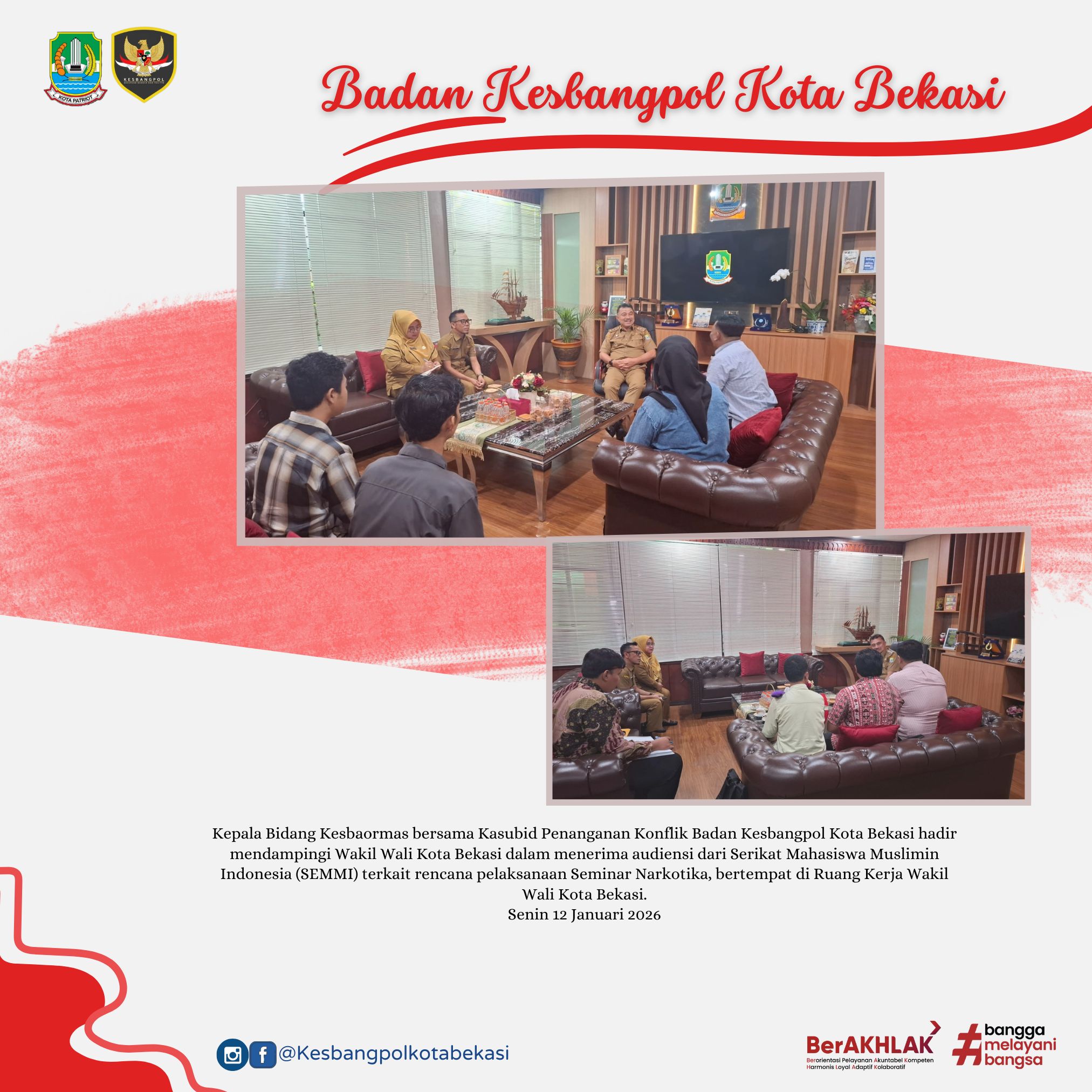 READ MORESenin 12 Januari 2026. Kepala Bidang Kesbaormas bersama Kasubid Penanganan Konflik Badan Kesbangpol Kota Bekasi hadir mendampingi Wakil Wali Kota Bekasi dalam menerima audiensi dari (SEMMI) terkait ...