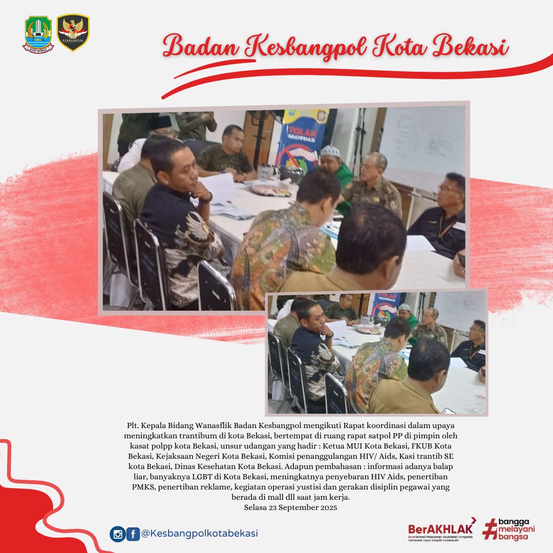 READ MOREKota Bekasi, Selasa 23 Septmber 2025 Plt. Kepala Bidang Wanasflik Badan Kesbangpol mengikuti Rapat koordinasi dalam upaya meningkatkan trantibum di kota Bekasi, bertempat di ruang rapat satpol PP d ...