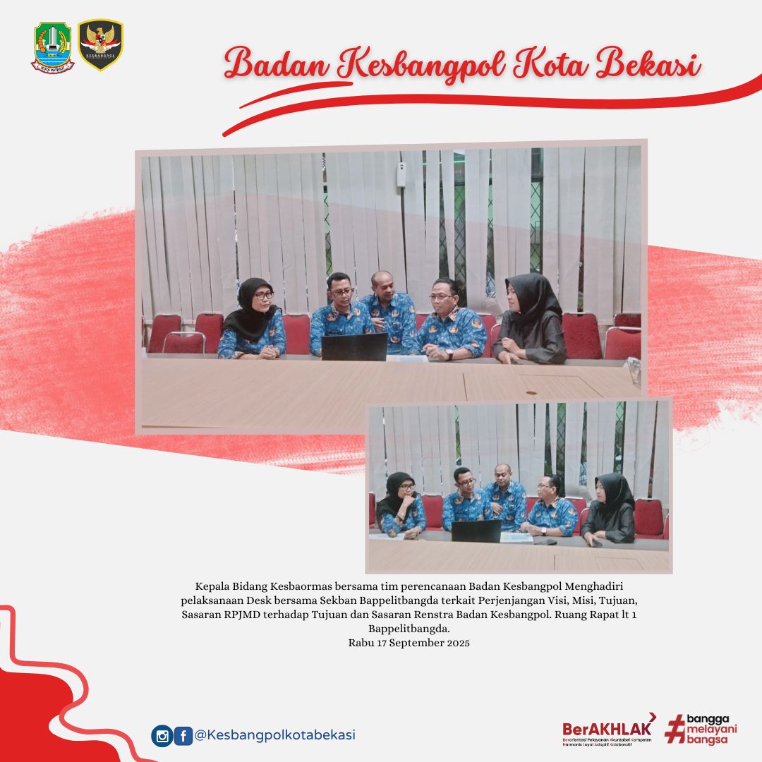 READ MORERabu 17 September 2025 Kepala Bidang Kesbaormas bersama tim perencanaan Badan Kesbangpol Menghadiri pelaksanaan Desk bersama Sekban Bappelitbangda terkait Perjenjangan Visi, Misi, Tujuan, Sasaran R ...