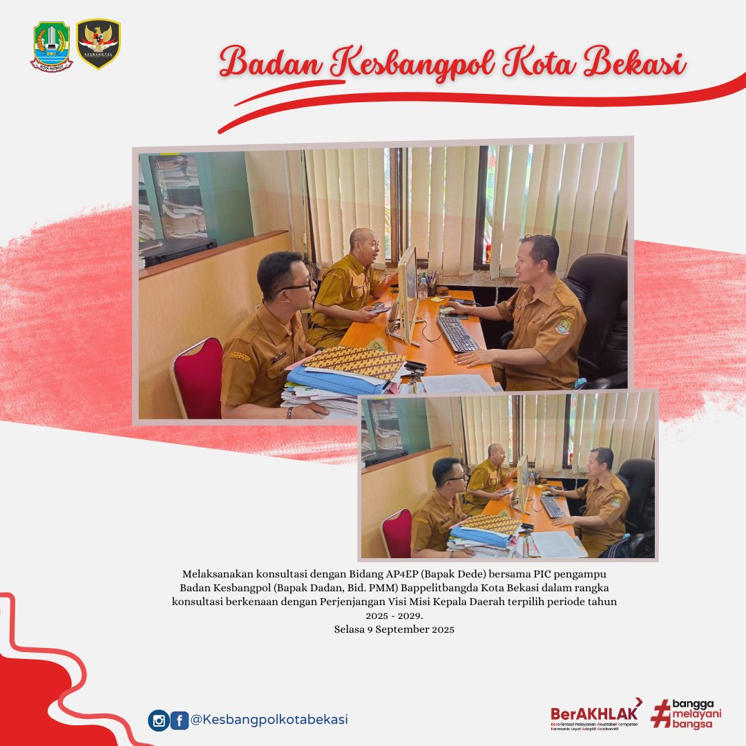 READ MOREKota Bekasi, Selasa 9 September 2025 Melaksanakan konsultasi dengan Bidang AP4EP (Bapak Dede) bersama PIC pengampu Badan Kesbangpol (Bapak Dadan, Bid. PMM) Bappelitbangda Kota Bekasi dalam rangka k ...