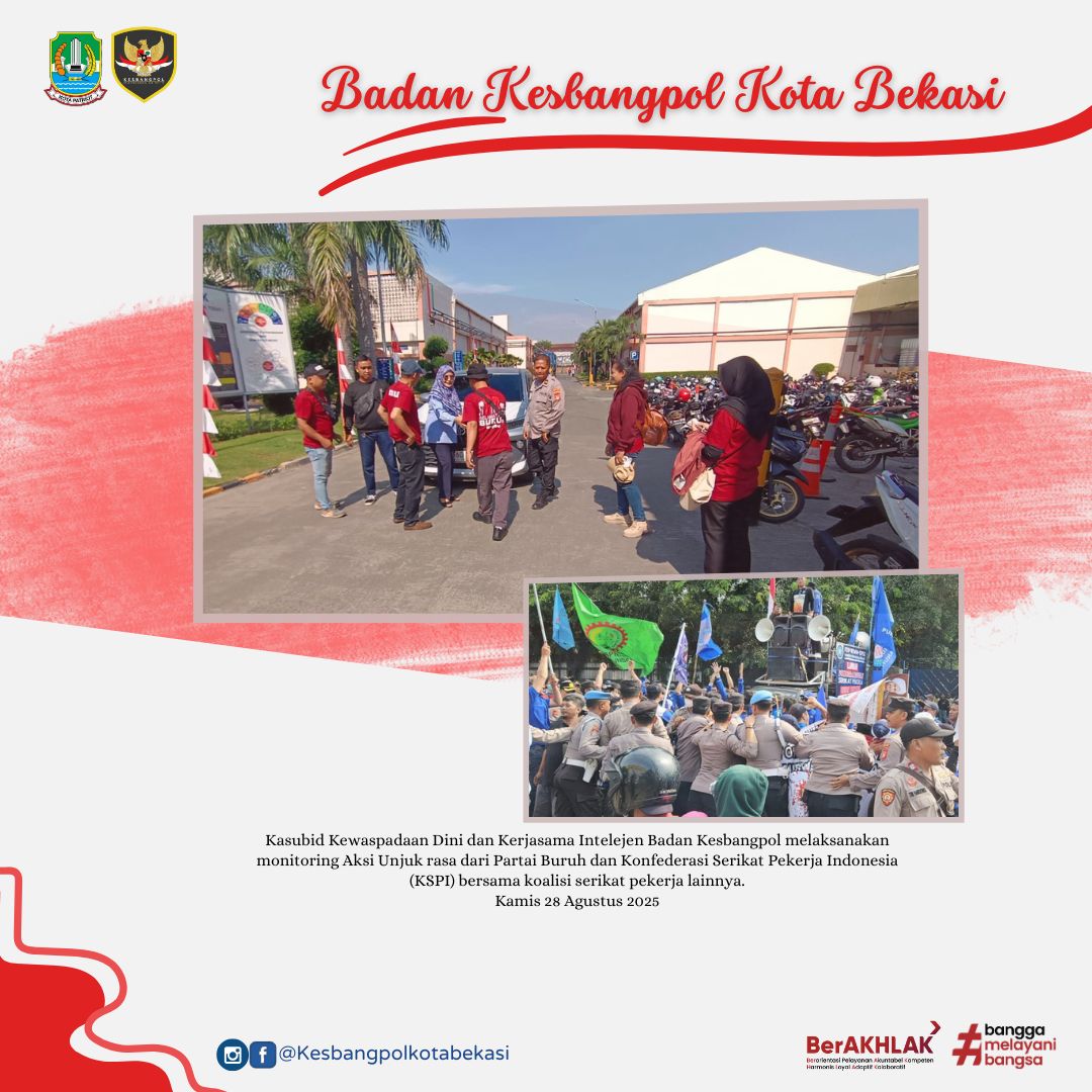 READ MOREKamis, 28 Agustus 2025 Kasubid Kewaspadaan Dini dan Kerjasama Intelejen Badan Kesbangpol melaksanakan monitoring Aksi Unjuk rasa dari Partai Buruh dan Konfederasi Serikat Pekerja Indonesia (KSPI) b ...