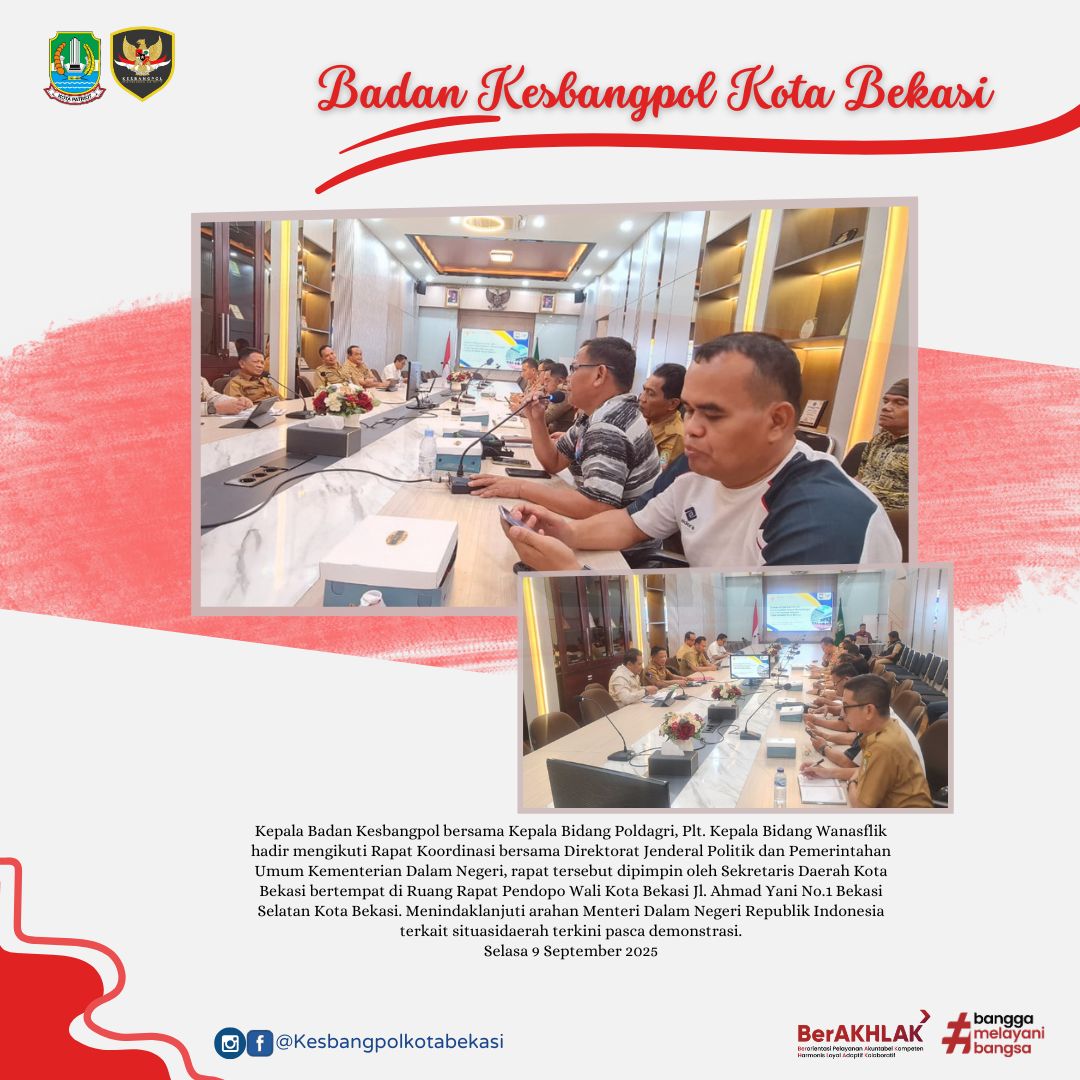 Kota Bekasi, Selasa 9 September 2025 Kepala Badan Kesbangpol bersama Kepala Bidang Poldagri, Plt. Kepala Bidang Wanasflik hadir mengikuti Rapat Koordinasi bersama Direktorat Jenderal Politik dan Pe ...