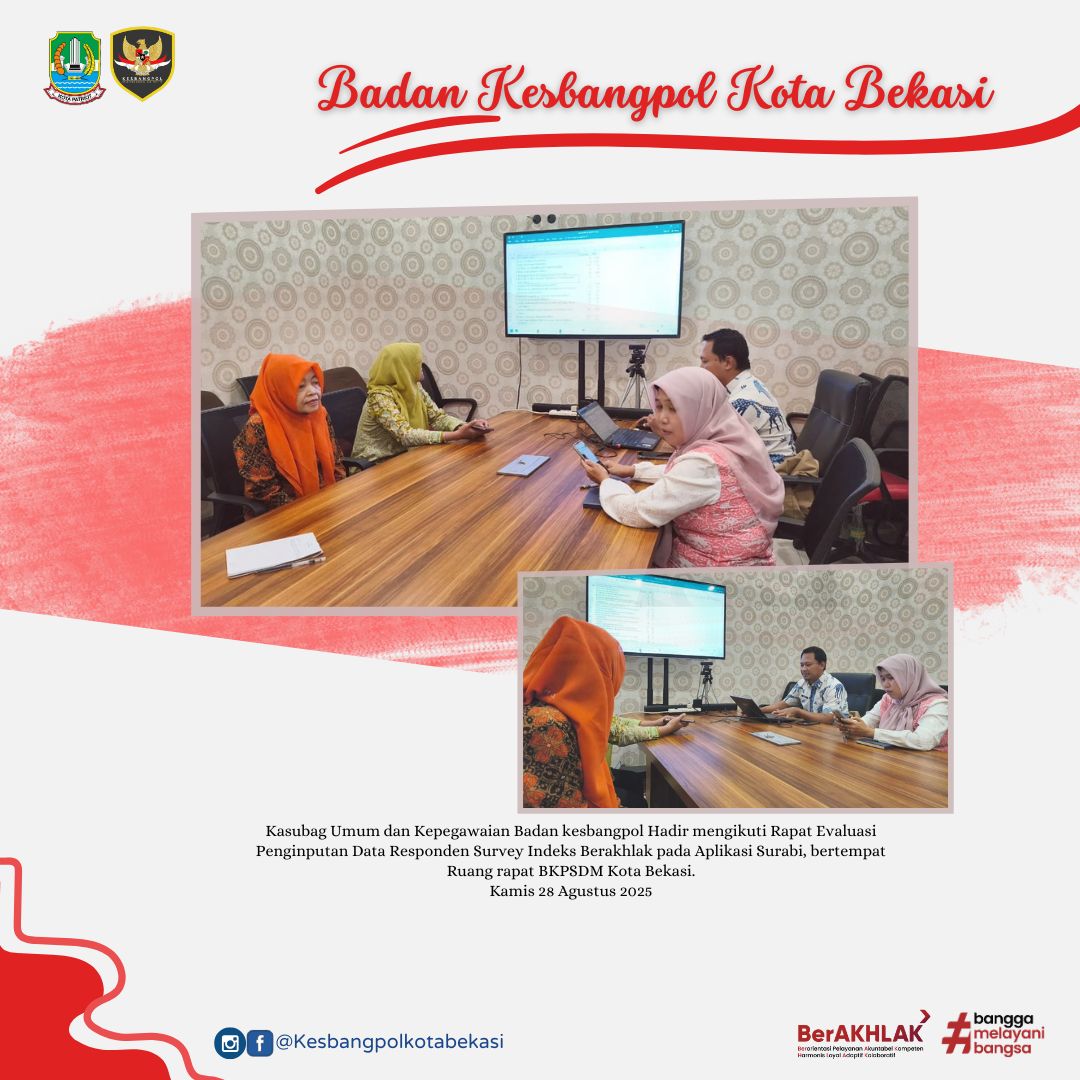READ MOREKota Bekasi, 28 Agustus 2025 Kasubag Umum dan Kepegawaian Badan kesbangpol Hadir mengikuti Rapat Evaluasi Penginputan Data Responden Survey Indeks Berakhlak pada Aplikasi Surabi, bertempat Ruang ra ...