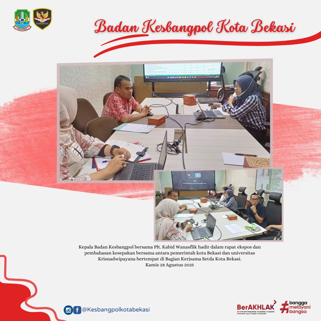 READ MOREKamis 28 Agustus 2025 Kepala Badan Kesbangpol bersama Plt. Kabid Wanasflik hadir dalam rapat ekspos dan pembahasan kesepakan bersama antara pemerintah kota Bekasi dan universitas Krisnadwipayana be ...