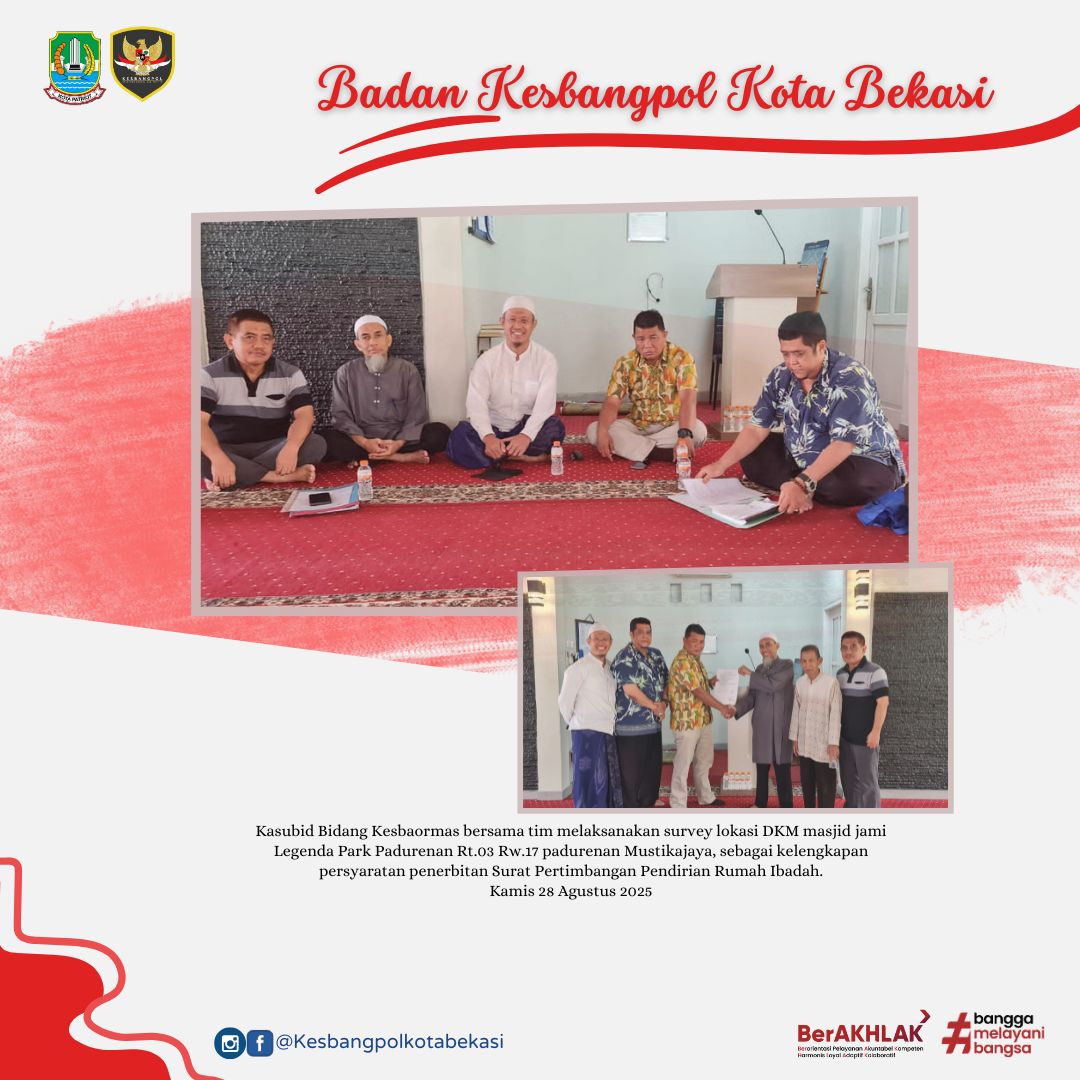 READ MOREKamis, 28 Agustus 2025 Kasubid Bidang Kesbaormas bersama tim melaksanakan survey lokasi DKM masjid jami Legenda Park Padurenan Rt.03 Rw.17 padurenan Mustikajaya, sebagai kelengkapan persyaratan pen ...