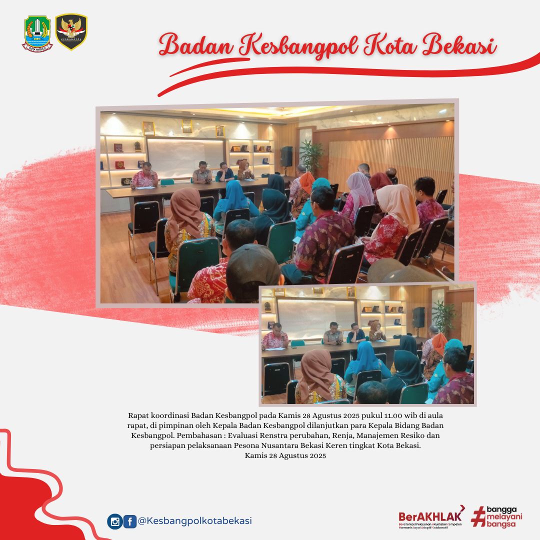 Kamis, 28 Agustus 2025 Rapat koordinasi Badan Kesbangpol pada Kamis 28 Agustus 2025 pukul 11.00 wib di aula rapat, di pimpinan oleh Kepala Badan Kesbangpol dilanjutkan para Kepala Bidang Badan Kesb ...