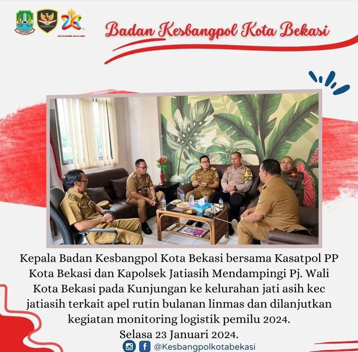 Kota Bekasi, Selasa 23 Januari 2024. Kepala Badan Kesbangpol Kota Bekasi Bersama Kasatpol PP Kota Bekasi Dan Kapolsek Jatiasih Mendampingi Pj. Wali Kota Bekasi Pada Kunjungan Ke Kelurahan Jati Asih, Kecamatan Jatiasih Terkait Apel Rutin Bulanan Linmas Dan Dilanjutkan Kegiatan Monitoring Logistik Pemilu 2024.