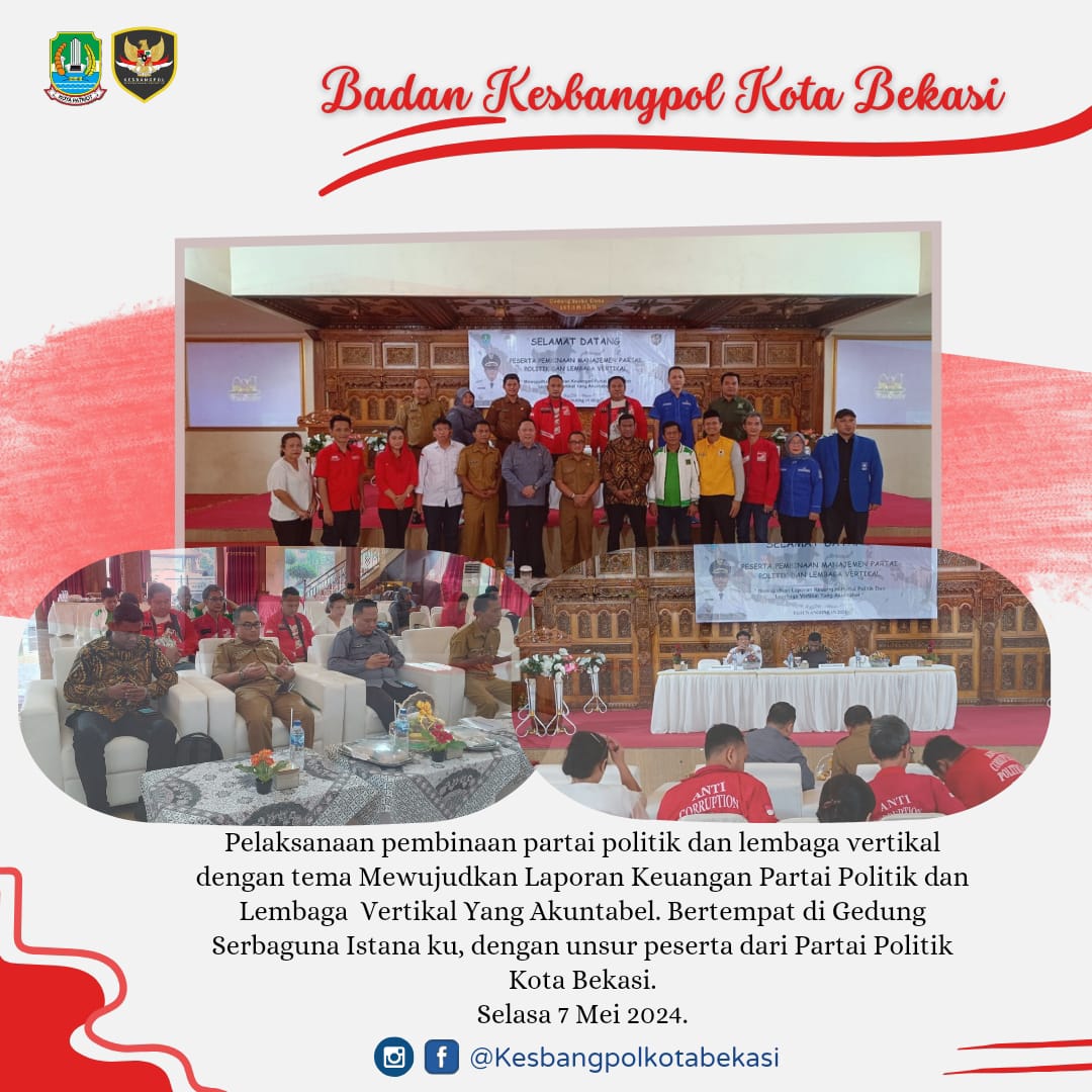 Pelaksanaan Pembinaan Partai Politik Dan Lembaga Vertikal Dengan Tema Mewujudkan Laporan Keuangan Partai Politik Dan Lembaga Vertikal Yang Akuntabel. Bertempat Di Gedung Serbaguna Istana Ku. Dengan Unsur Peserta Dari Partai Politik Kota Bekasi.
