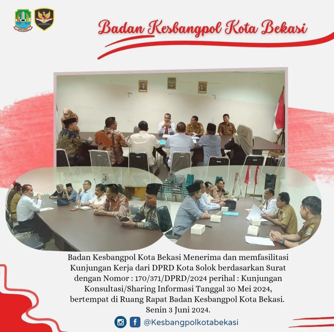 Badan Kesbangpol Kota Bekasi Menerima Dan Memfasilitasi Kunjungan Kerja Dari DPRD Kota Solok Berdasarkan Surat Dengan Nomor : 170/371/DPRD/2024 Perihal : Kunjungan Konsultasi/Sharing Informasi Tanggal 30 Mei 2024, Dilaksanakan Bertempat Di Ruang Rapat Badan Kesbangpol Kota Bekasi.