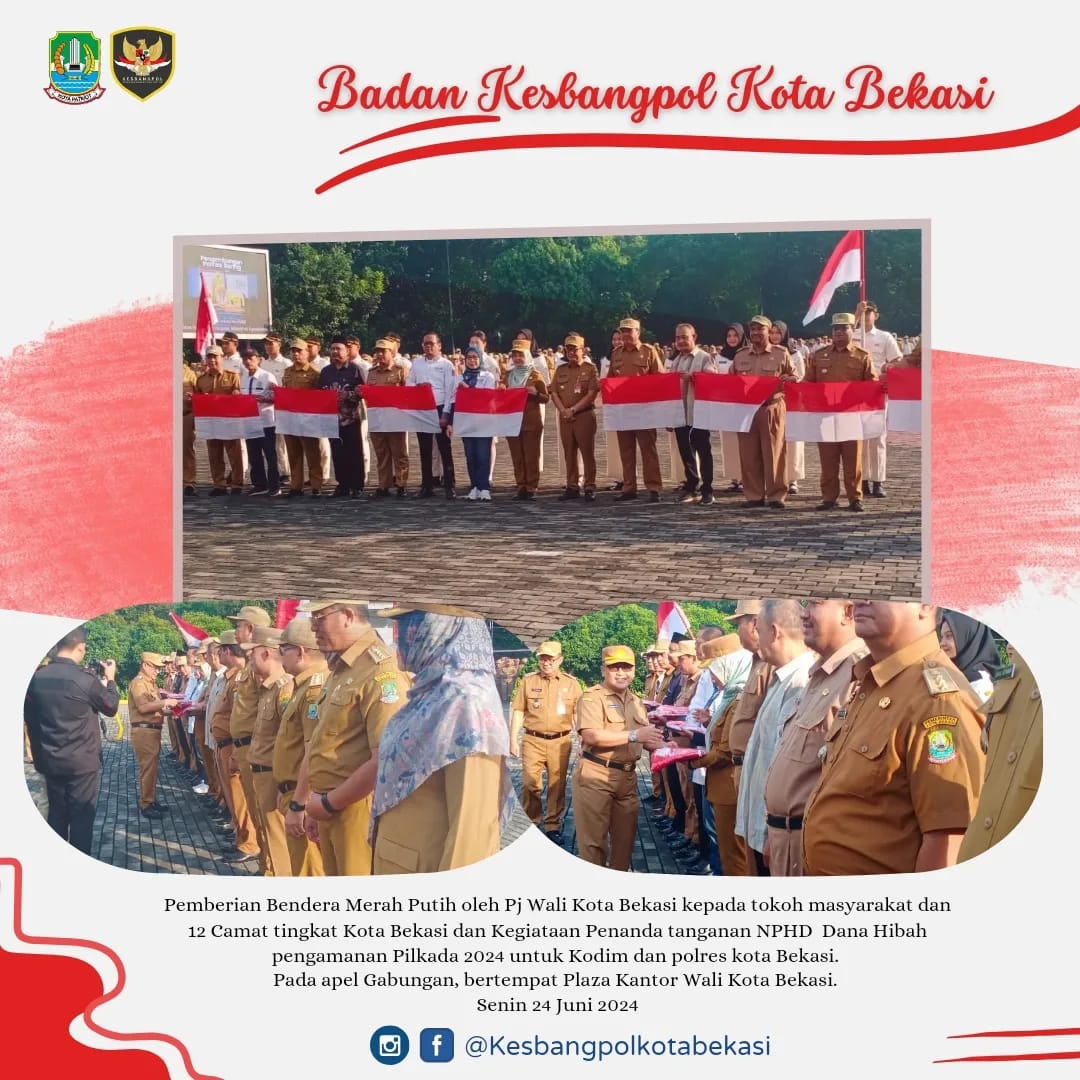 Pemberian Bendera Merah Putih Oleh Pj Wali Kota Bekasi Kepada Tokoh Masyarakat Dan 12 Camat Tingkat Kota Bekasi Dan Kegiataan Penanda Tanganan NPHD Dana Hibah Pengamanan Pilkada 2024 Untuk Kodim Dan Polres Kota Bekasi.