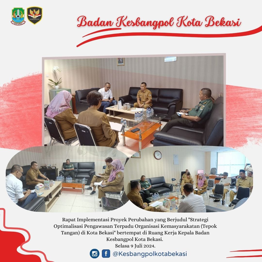 Rapat Implementasi Proyek Perubahan Yang Berjudul "Strategi Optimalisasi Pengawasan Terpadu Organisasi Kemasyarakatan (Tepok Tangan) Di Kota Bekasi" Bertempat Di Ruang Kerja Kepala Badan Kesbangpol Kota Bekasi.
