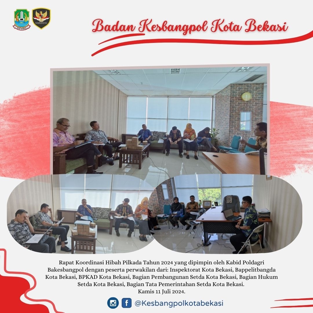 Rapat Koordinasi Hibah Pilkada Tahun 2024 Yang Dipimpin Oleh Kabid Poldagri Bakesbangpol Dengan Peserta Perwakilan Dari: Inspektorat Kota Bekasi, Bappelitbangda Kota Bekasi, BPKAD Kota Bekasi, Bagian Pembangunan Setda Kota Bekasi, Bagian Hukum Setda Kota Bekasi, Bagian Tata Pemerintahan Setda Kota Bekasi.