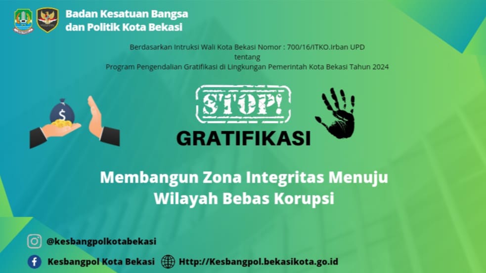 Dalam Rangka Mewujudkan Pemerintah Kota Bekasi Yang Bersih Dan Bebas Dari Korupsi, Kolusi Dan Nepotisme, Setiap Pemberian Gratifikasi Kepada Pegawai Negeri Dan Penyelenggara Negara Yang Berhubungan Dengan Jabatan Dan Atau Pekerjaannya Yang Wajib Dilaporkan Kepada Komisi Pemberantasan Korupsi Atau Melalui Unit Pengendalian Gratifikasi Sesuai Dengan Peraturan Wali Kota Bekasi Nomor 24 Tahun 2021 Tentang Pengendalian Gratifikasi Di Lingkungan Pemerintah Kota Bekasi.