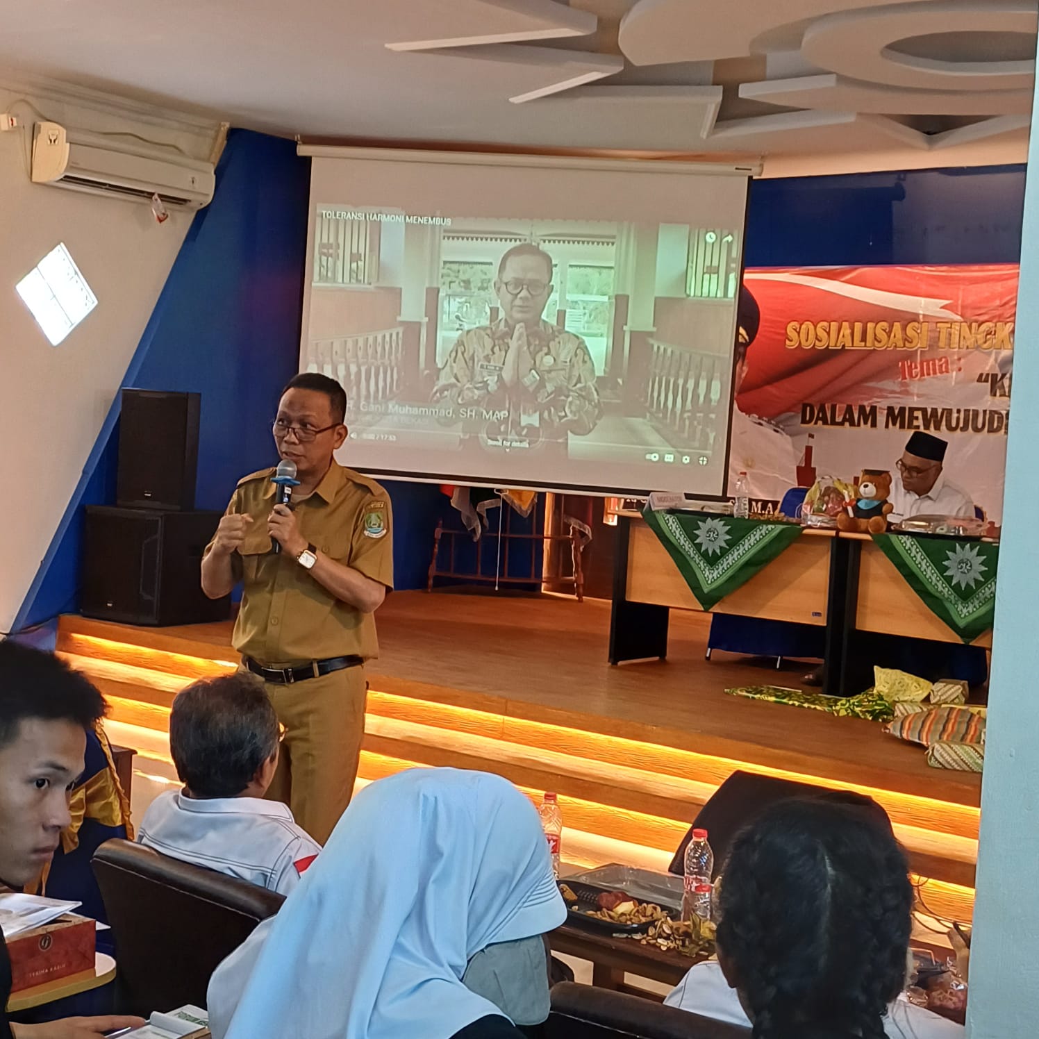 Penyampaian Materi Oleh Kabid Kesbaormas Sebagai Narasumber Dalam Kegiatan Sosialisasi Tingkat SLTA Negeri Dan Swasta Dengan Tema Keharmonisan Anak Bangsa Dalam Mewujudkan Moderasi Beragama Di Kota Bekasi Di Gedung Institut Bisnis Muhammadiyah Margahayu Bekasi Timur Kota Bekasi.