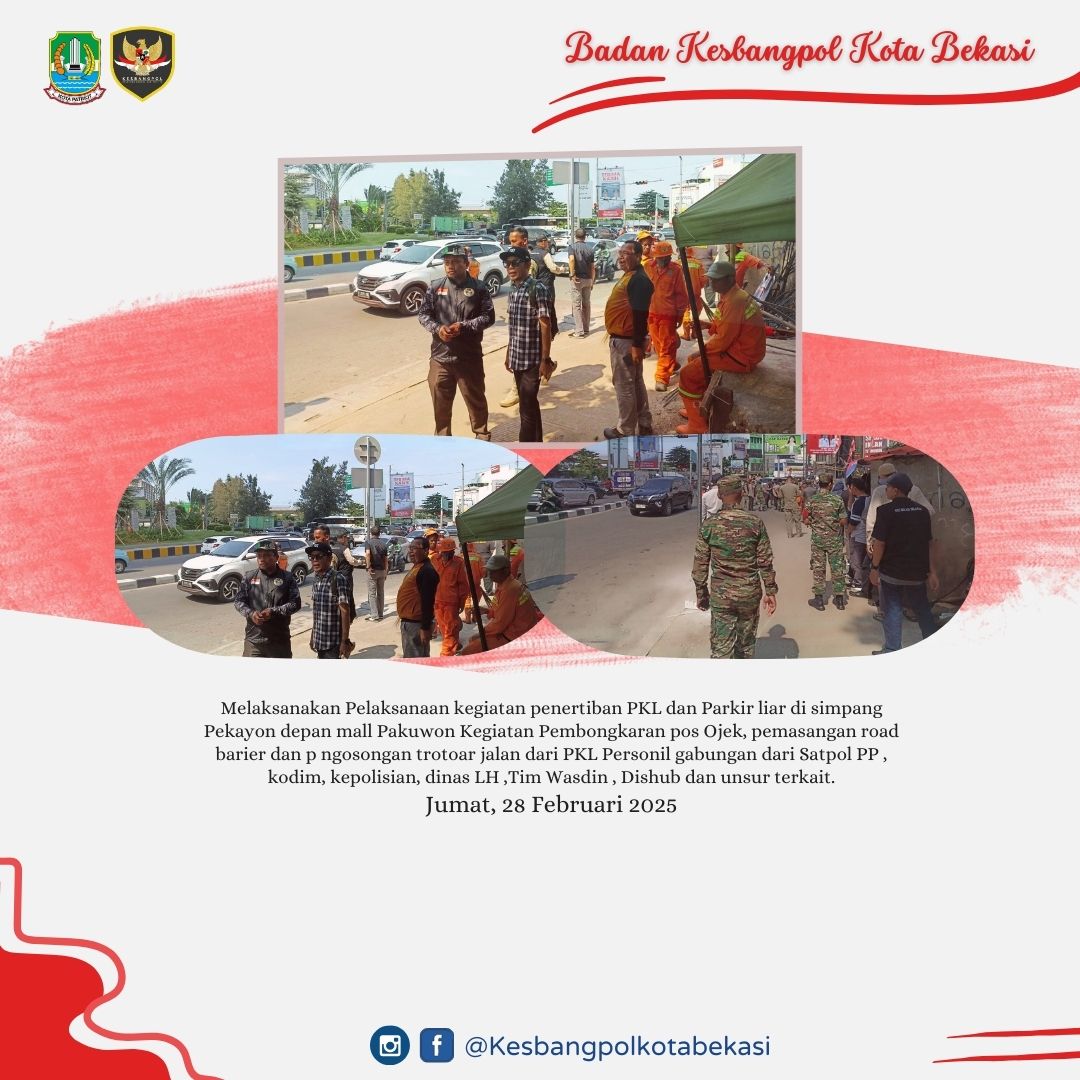 Melaksanakan Pelaksanaan Kegiatan Penertiban PKL Dan Parkir Liar Di Simpang Pekayon Depan Mall Pakuwon Kegiatan Pembongkaran Pos Ojek, Pemasangan Road Barier Dan P Ngosongan Trotoar Jalan Dari PKL Personil Gabungan Dari Satpol PP , Kodim, Kepolisian, Dinas LH ,Tim Wasdin , Dishub Dan Unsur Terkait.