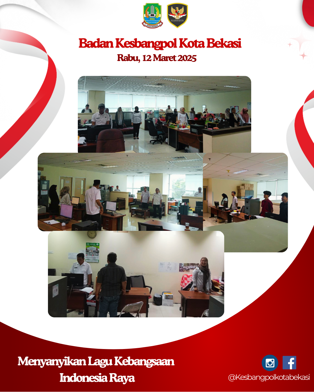 Menyanyi Lagu Indonesia Raya “Bentuk Penghormatan Dan Cinta Terhadap Negara Kesatuan Republik Indonesia, Seluruh Aparatur Badan Kesatuan Bangsa Dan Politik Kota Bekasi Menyanyikan Lagu Kebangsaan Indonesia Raya Secara Serentak Pada Hari Rabu 12 Maret 2025, Pukul 10.00 WIB.