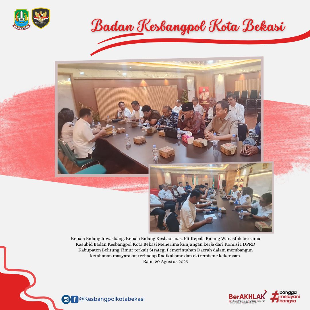 Kepala Bidang Idwasbang, Kepala Bidang Kesbaormas, Plt Kepala Bidang Wanasflik Bersama Kasubid Badan Kesbangpol Kota Bekasi Menerima Kunjungan Kerja Dari Komisi I DPRD Kabupaten Belitung Timur Terkait Strategi Pemerintahan Daerah Dalam Membangun Ketahanan Masyarakat Terhadap Radikalisme Dan Ektremisme Kekerasan.