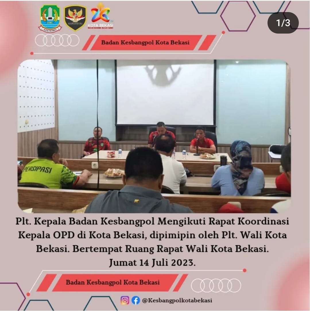 Kota Bekasi-Jumat 14 Juli 2023, Plt. Kepala Badan Kesbangpol Mengikuti Rapat Koordinasi Kepala OPD Di Kota Bekasi, Dipimipin Oleh Plt. Wali Kota Bekasi. Bertempat Ruang Rapat Wali Kota Bekasi.