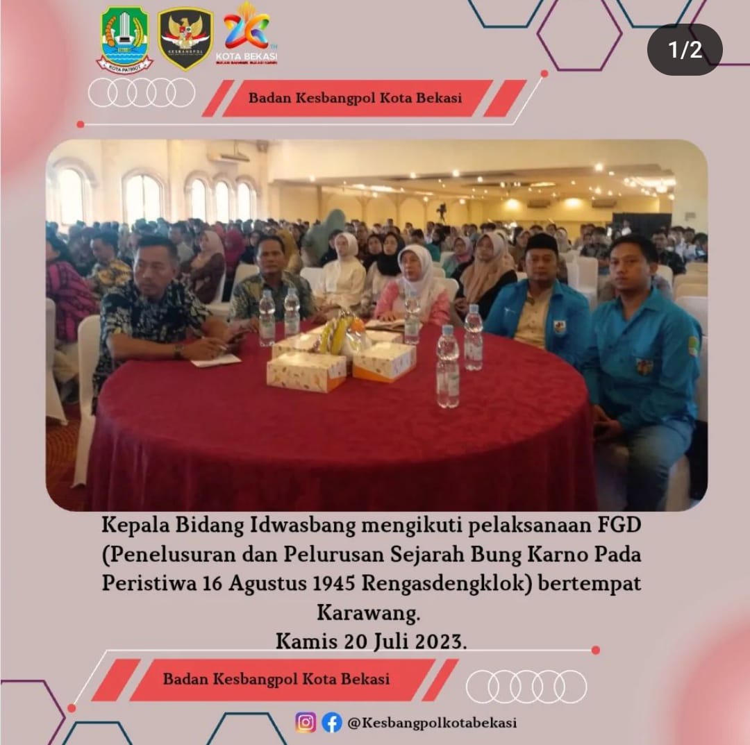 Kota Bekasi-Kamis 20 Juli 2023, Kepala Bidang Idwasbang Mengikuti Pelaksanaan FGD (Penelusuran Dan Pelurusan Sejarah Bung Karno Pada Peristiwa 16 Agustus 1945 Rengasdengklok) Bertempat Karawang.