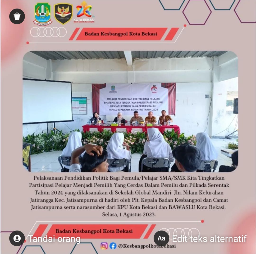 Kota Bekasi-Selasa, 1 Agustus 2023. Pelaksanaan Pendidikan Politik Bagi Pemula/Pelajar SMA/SMK Kita Tingkatkan Partisipasi Pelajar Menjadi Pemilih Yang Cerdas Dalam Pemilu Dan Pilkada Serentak Tahun 2024 Yang Dilaksanakan Di Sekolah Global Mandiri Jln. Nilam Kelurahan Jatirangga Kec. Jatisampurna Di Hadiri Oleh Plt. Kepala Badan Kesbangpol Dan Camat Jatisampurna Serta Narasumber Dari KPU Kota Bekasi Dan BAWASLU Kota Bekasi.