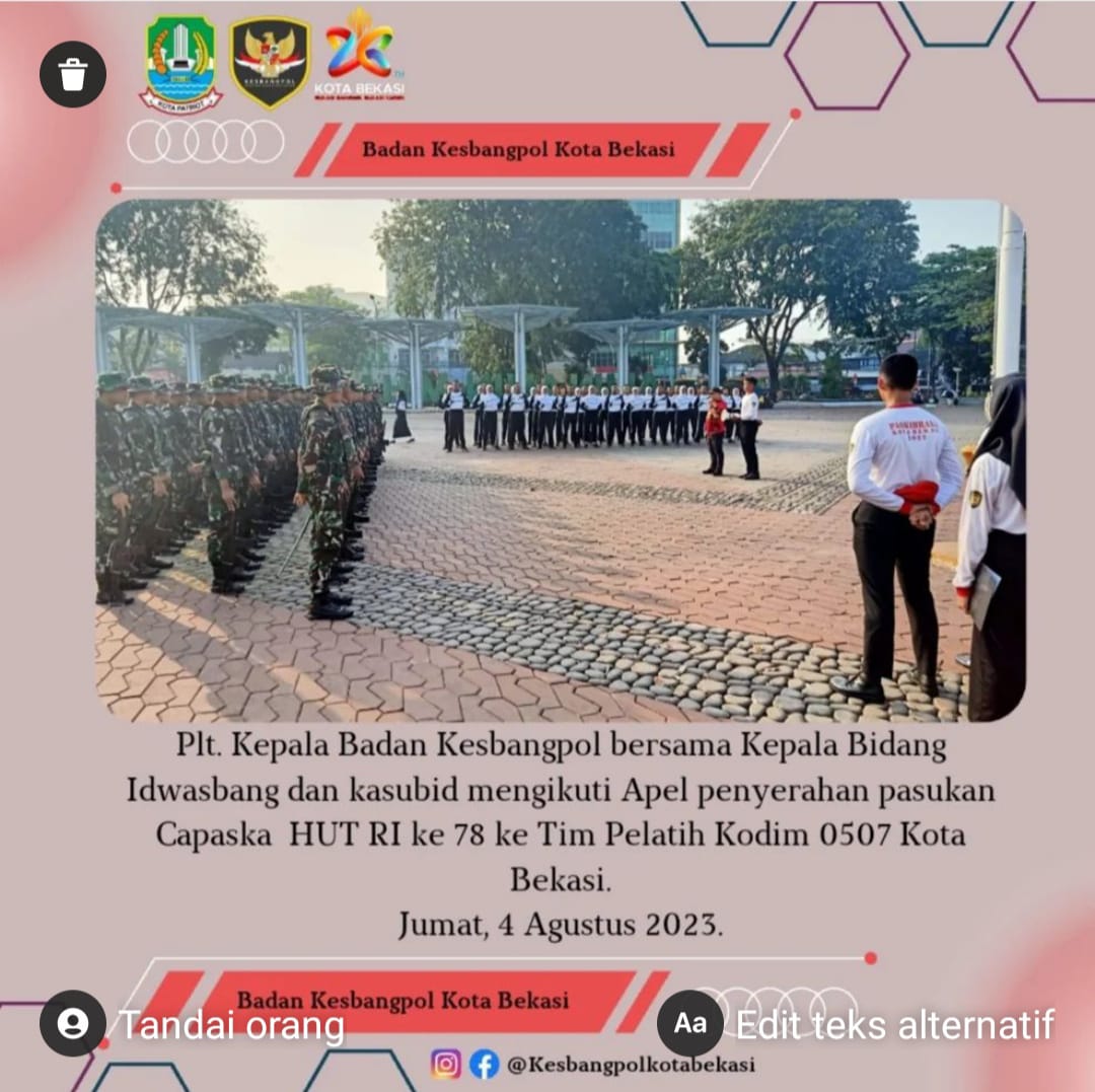 Bekasi-Jumat, 4 Agustus 2023. Plt. Kepala Badan Kesbangpol Bersama Kepala Bidang Idwasbang Dan Kasubid Mengikuti Apel Penyerahan Pasukan Capaska HUT RI Ke 78 Ke Tim Pelatih Kodim 0507 Kota Bekasi.