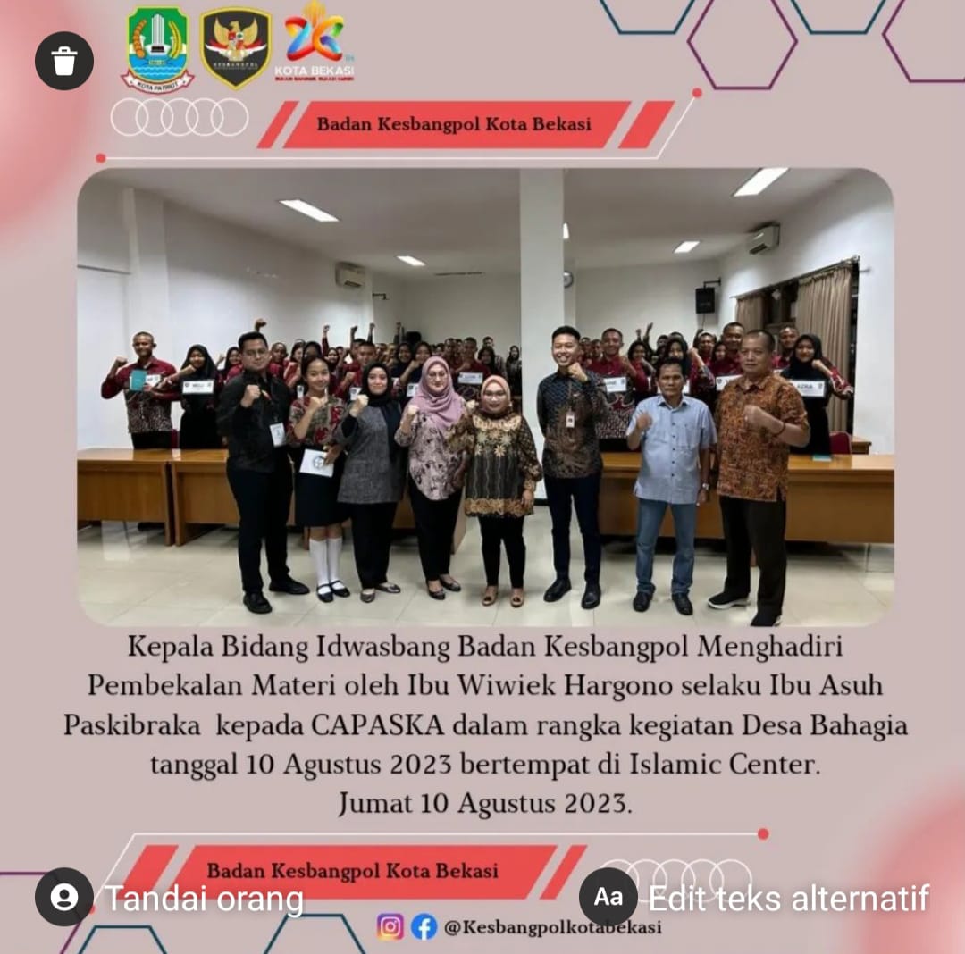 Bekasi-Jumat 11 Agustus 2023. Kepala Bidang Idwasbang Badan Kesbangpol Menghadiri Pembekalan Materi Oleh Ibu Wiwiek Hargono Selaku Ibu Asuh Paskibraka Kepada CAPASKA Dalam Rangka Kegiatan Desa Bahagia Tanggal 10 Agustus 2023 Bertempat Di Islamic Center.