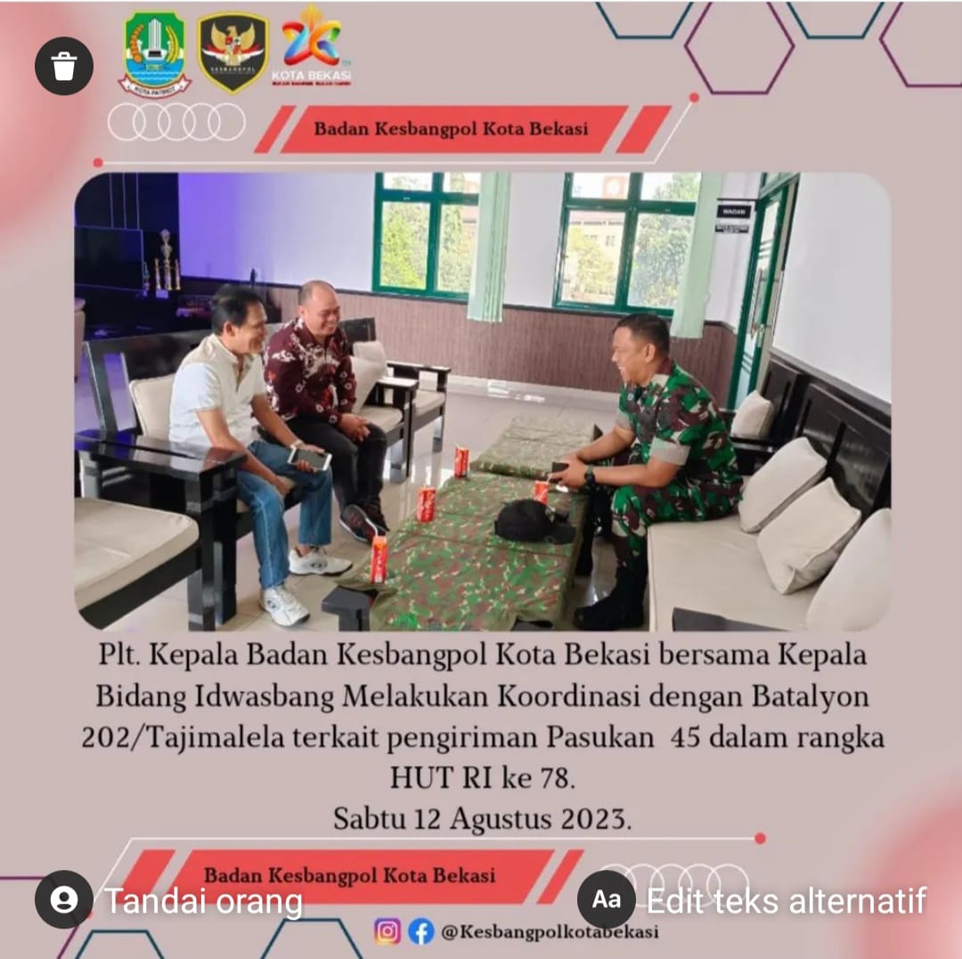 Bekasi-Sabtu 12 Agustus 2023. Plt. Kepala Badan Kesbangpol Kota Bekasi Bersama Kepala Bidang Idwasbang Melakukan Koordinasi Dengan Batalyon 202/Tajimalela Terkait Pengiriman Pasukan 45 Dalam Rangka HUT RI Ke 78.