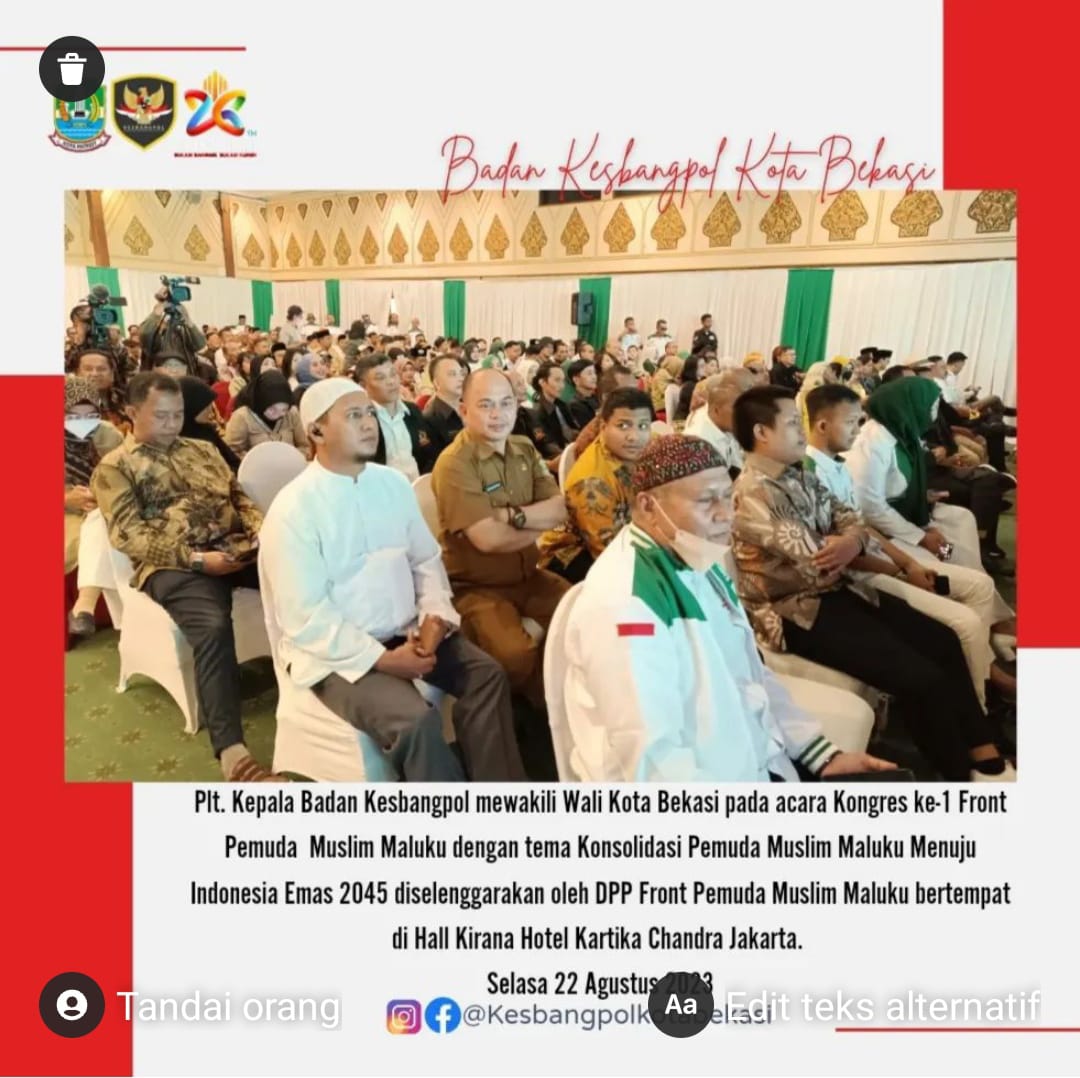 Jakarta. Selasa 22 Agustus 2023, Plt. Kepala Badan Kesbangpol Mewakili Wali Kota Bekasi Pada Acara Kongres Ke-1 Front Pemuda Muslim Maluku Dengan Tema Konsolidasi Pemuda Muslim Maluku Menuju Indonesia Emas 2045 Diselenggarakan Oleh DPP Front Pemuda Muslim Maluku Bertempat Di Hall Kirana Hotel Kartika Chandra Jakarta.