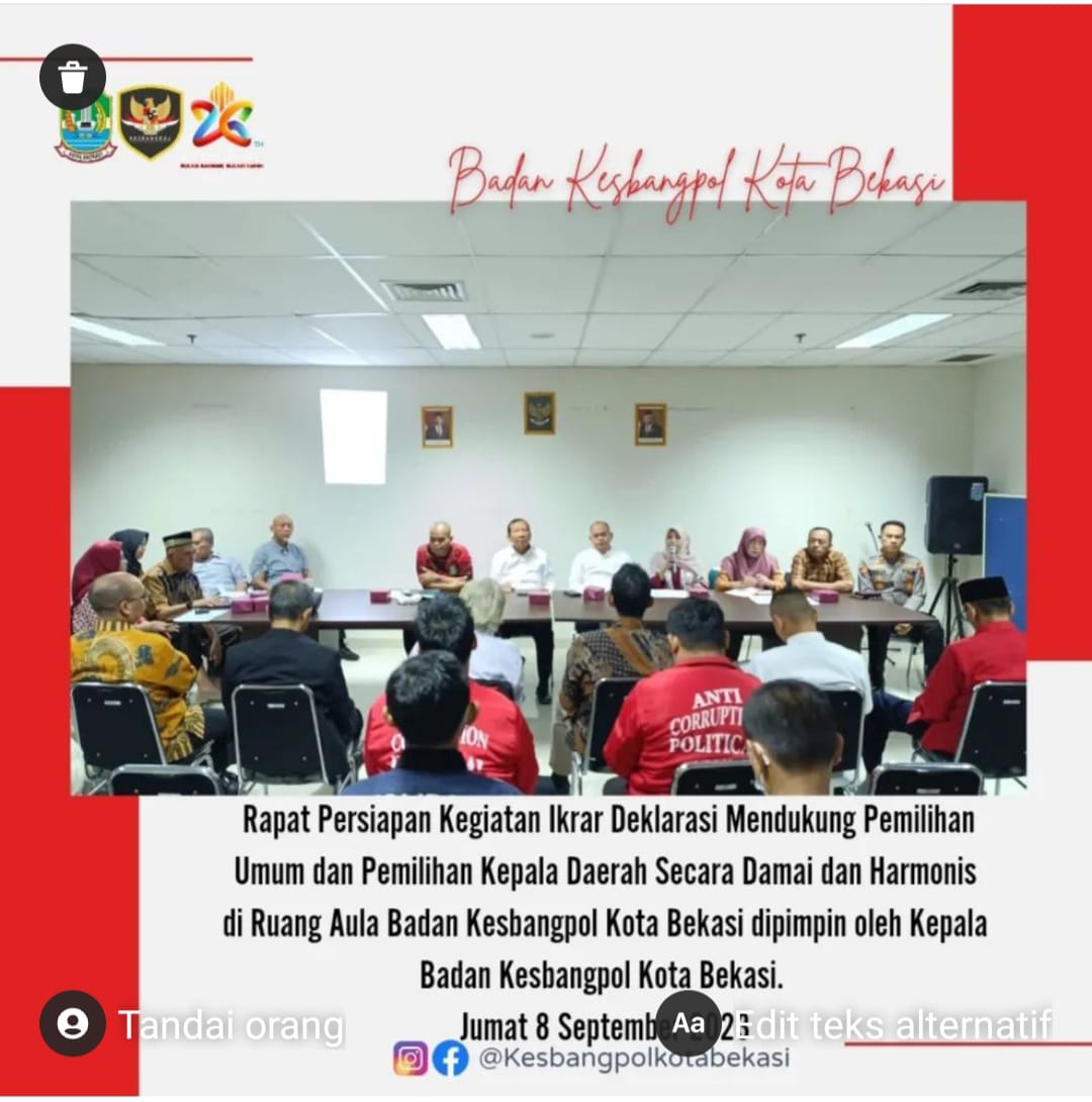 Bekasi. Jumat 8 September 2023, Rapat Persiapan Kegiatan Ikrar Deklarasi Mendukung Pemilihan Umum Dan Pemilihan Kepala Daerah Secara Damai Dan Harmonis Di Ruang Aula Badan Kesbangpol Kota Bekasi Dipimpin Oleh Kepala Badan Kesbangpol Kota Bekasi.