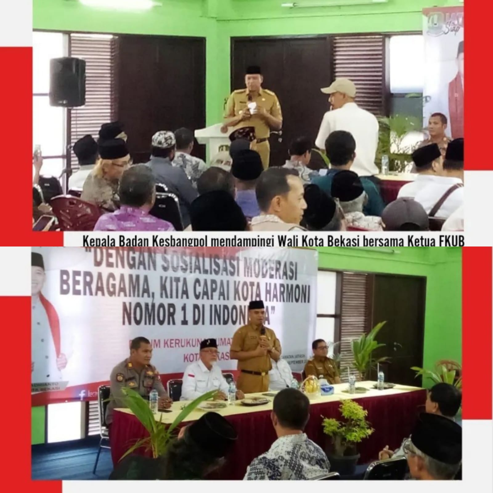 Bekasi. Senin 11 September 2023, Kepala Badan Kesbangpol Mendampingi Wali Kota Bekasi Bersama Ketua FKUB Kota Bekasi Menghadiri Sosialisasi Moderasi Beragama, Kita Capai Kota Harmoni Nomor 1 Di Indonesia Diselenggarakan Oleh FKUB Kota Bekasi, Bertempat Di Kelurahan Jatiluhur Kecamatan Jatiasih.