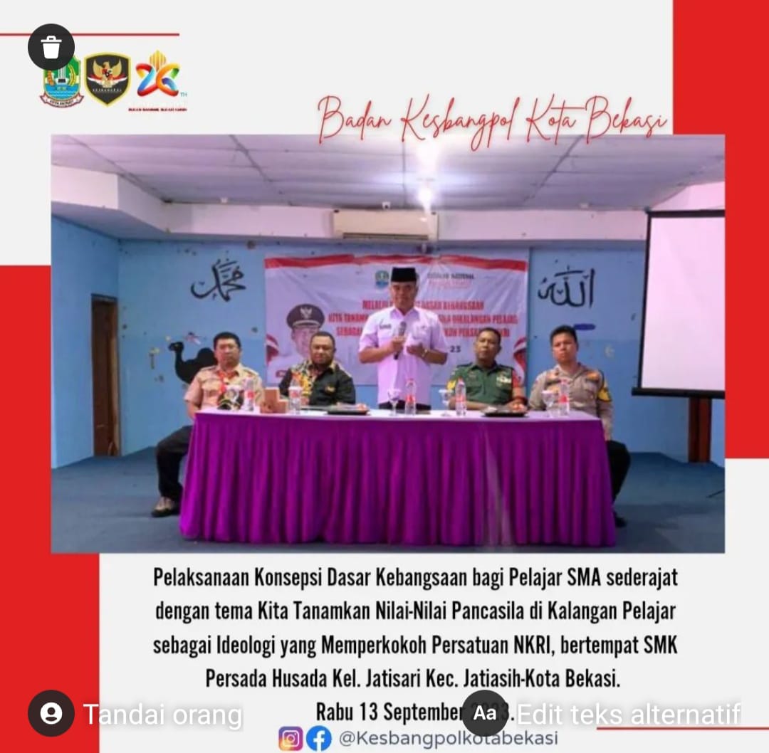 Bekasi. Rabu 13 September 2023, Pelaksanaan Konsepsi Dasar Kebangsaan Bagi Pelajar SMA Sederajat Dengan Tema Kita Tanamkan Nilai-Nilai Pancasila Di Kalangan Pelajar Sebagai Ideologi Yang Memperkokoh Persatuan NKRI, Dihadiri Oleh Kepala Badan Kesbangpol Kota Bekasi Bertempat SMK Persada Husada Kel. Jatisari Kec. Jatiasih-Kota Bekasi.