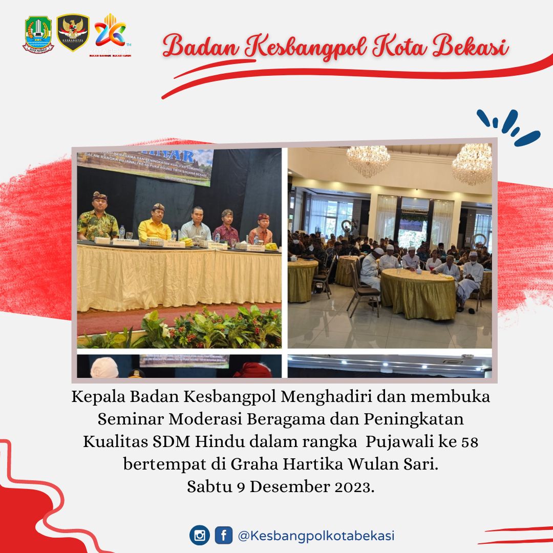 Bekasi, Sabtu 9 Desember 2023. Kepala Badan Kesbangpol Menghadiri Dan Membuka Seminar Moderasi Beragama Dan Peningkatan Kualitas SDM Hindu Dalam Rangka Pujawali Ke 58 Bertempat Di Graha Hartika Wulan Sari.