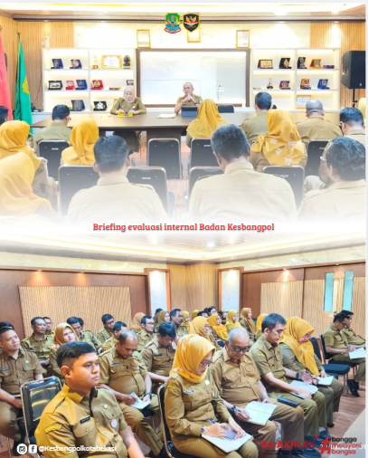 Badan Kesatuan Bangsa Dan Politik (Kesbangpol) Kota Bekasi Melaksanakan Briefing Evaluasi Internal Yang Dipimpin Langsung Oleh Kepala Badan Kesbangpol, Bertempat Di Aula Badan Kesbangpol. Kegiatan Ini Dihadiri Oleh Sekretaris Badan Kesbangpol, Para Kepala Bidang, Para Kepala Subbidang, Kasubag Umpeg, Jafung Perencanaan, Jafung Keuangan, Serta Seluruh Aparatur Di Lingkungan Badan Kesbangpol Kota Bekasi.