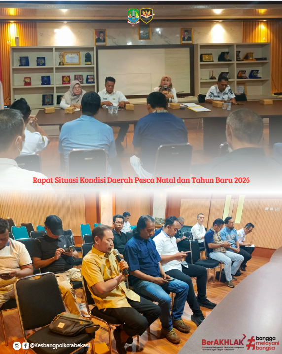 Badan Kesatuan Bangsa Dan Politik Kota Bekasi Melaksanakan Rapat Situasi Dan Kondisi Daerah Pasca Perayaan Natal Dan Tahun Baru 2026 Pada Rabu, 14 Januari 2026, Bertempat Di Ruang Rapat Badan Kesbangpol Kota Bekasi. Rapat Dipimpin Oleh Sekretaris Badan Kesbangpol Kota Bekasi, Didampingi Oleh Kepala Bidang (Wanasflik), Kepala Bidang (Poldagri), Kepala Bidang (Kesbaormas), Kasubid Kewaspadaan Dan Kerja Sama Intelijen, Serta Kasubid Penanganan Konflik, Dan Diikuti Oleh Para Pelaksana Substansi Terkait Di Lingkungan Badan Kesbangpol Kota Bekasi.